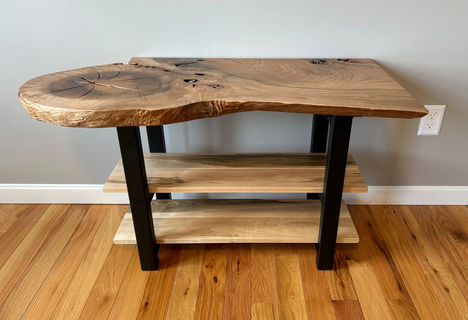 spalted maple live edge slab table with matte black steel legs, two shelves, 40" wide, 24" tall, 18" deep